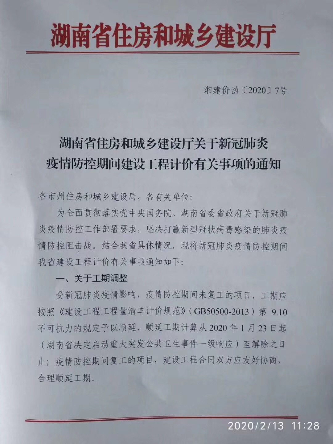 湖南省住房和城鄉建設廳關于新冠肺炎疫情防控期間工程計價有關事項的通知