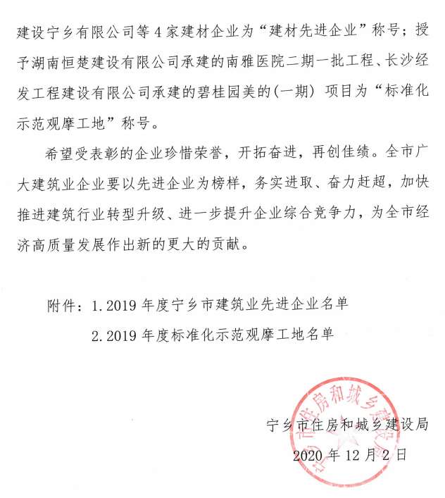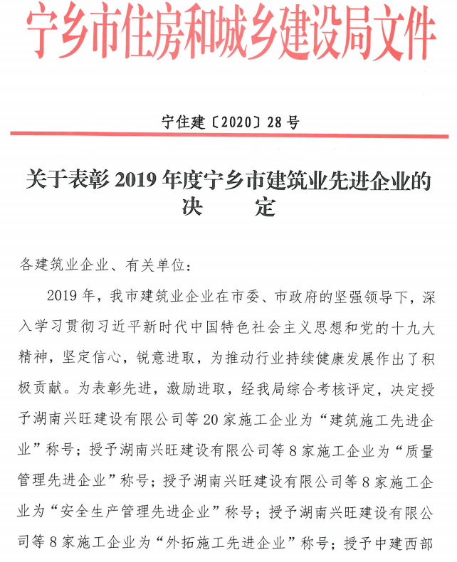 關于表彰2019年度寧鄉市建筑業先進企業的決定